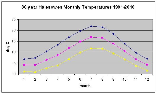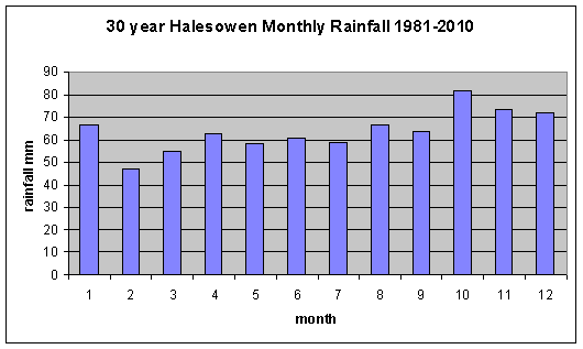 30 year Halesowen Observed Monthly Temps and Rainfall based on period 1981-2010 These are based on actual observations made in Halesowen over this period